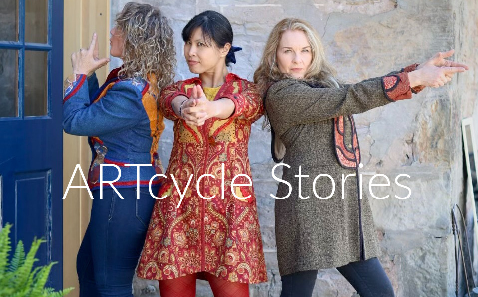 Taking up-cycling way UP. Taking materials no longer used, cutting into them and repurposing into artful garments. Especially those things lovingly made by hand and needles mostly made for home decor by family members who may not be here any more. To honour and respect the needle arts that has come down to us and show it off just one more time